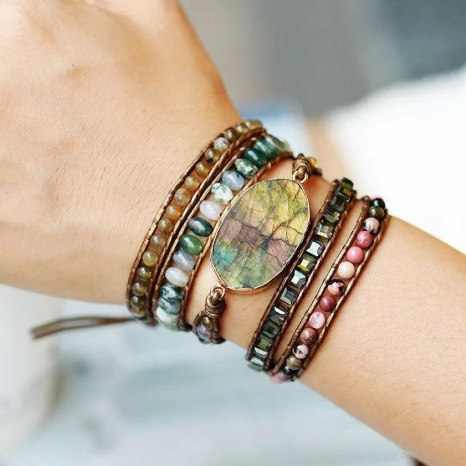 Today, I want to introduce you to one of my newest creations — a powerful trio wrapped into one handcrafted bracelet: Labradorite, Rhodochrosite, and Moss Agate. Together, they form what I call the Celestial Path Protection Wrap Bracelet.